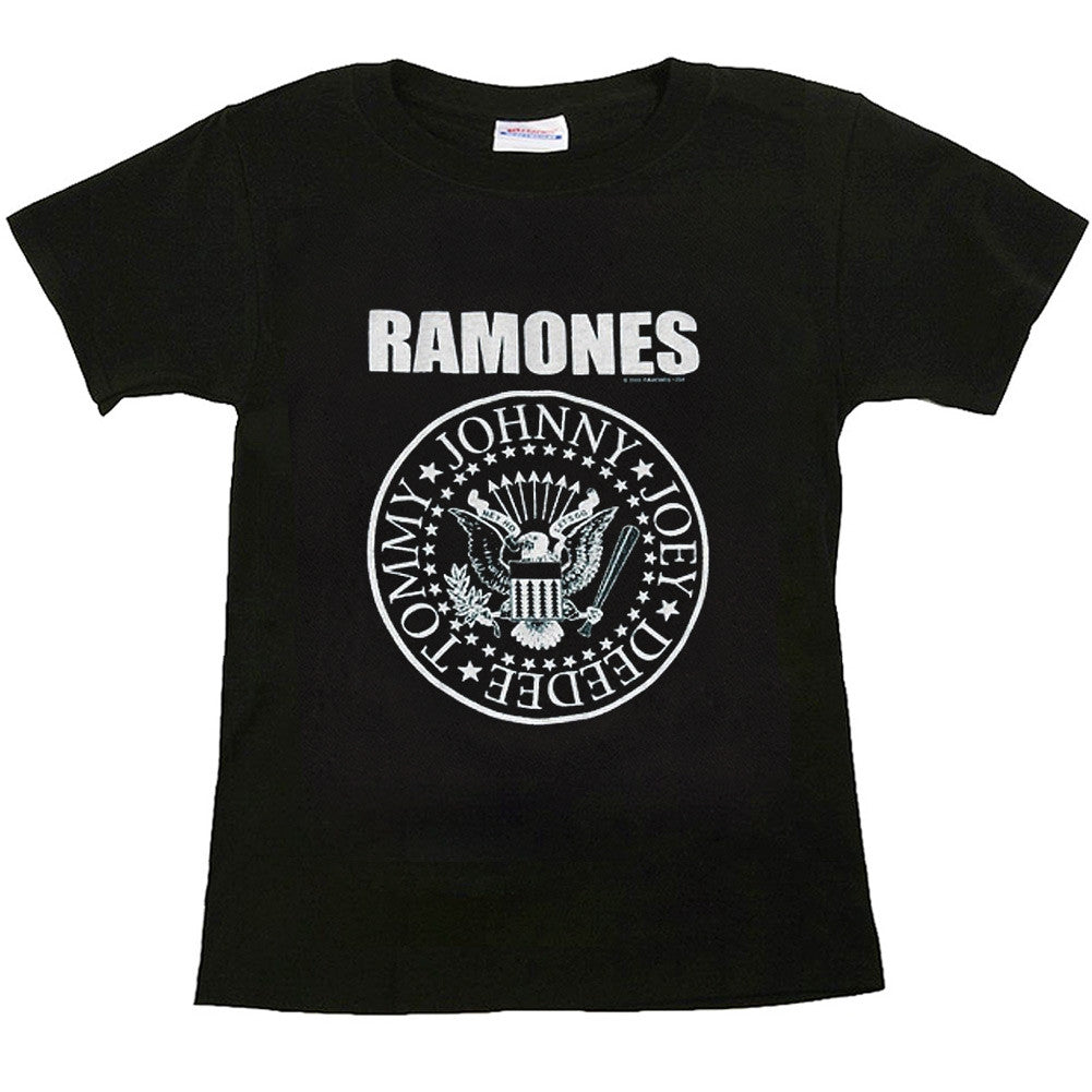Officially licensed, classic Ramones toddler t-shirt. The first punk rock group is represented here in our punk baby clothing. The presidential seal Ramones logo featuring the names of the band: Johnny, Joey, Dee Dee and Tommy.